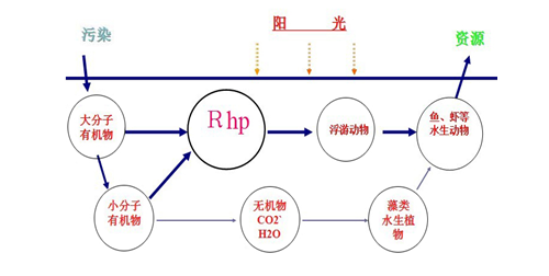 針對目前江河湖泊等開放性水域普遍富營養(yǎng)化和生態(tài)系統(tǒng)失衡導致水質(zhì)污染、藍藻暴發(fā)的環(huán)境問題,以生物工程技術為基礎,結(jié)合包括生態(tài)學、藻類學、流體力學、水產(chǎn)養(yǎng)殖學和自動控制學在內(nèi)的眾多領域的研究成果,以核心技術產(chǎn)品——RhP微生物制劑消耗水體中呈污染態(tài)的氮、磷、硫、碳等元素,在不耗氧的條件下完成“腐~生轉(zhuǎn)化”,為水生動物營造良好的生存環(huán)境,為浮游生物特別是浮游動物提供生長繁殖條件,為浮游生物食性的水生動物提供豐富的天然餌料,人類通過對這些水生動物的捕撈,將污染物質(zhì)成功轉(zhuǎn)化為可供利用的資源。