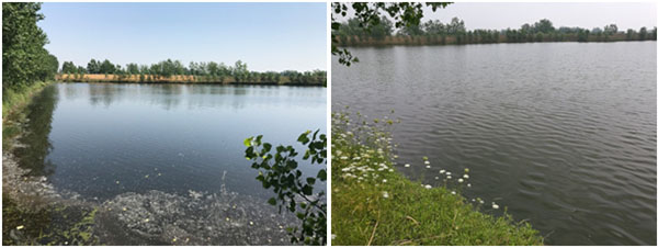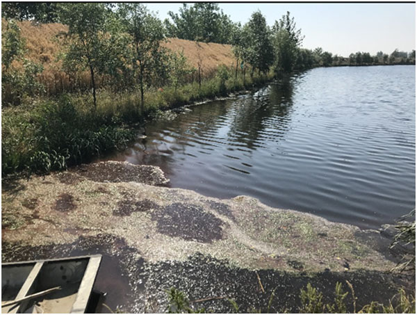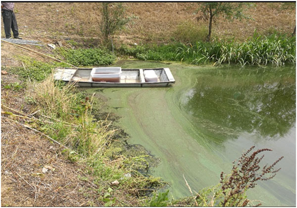 污水塘主要污染為醫(yī)藥化學污染,水體發(fā)黑,完全沒有透明度,惡臭熏人,長約238米,寬約182米,面積約3.3萬平方米,平均水深未知,據(jù)介紹為1米左右,底泥較厚;污水通過西南角污水渠流入水體,污水渠中水色發(fā)黑,透明度約15cm;在南側(cè)偏東位置有一出水閘門,有水流出直接進入河道;北側(cè)偏東位置,有一入水閘門,暫關(guān)停。
