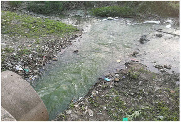 西河入水口,入水中含大量藍藻(水呈綠色)