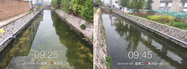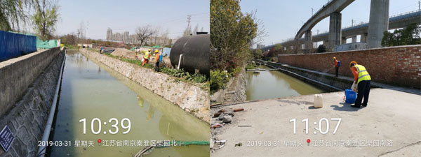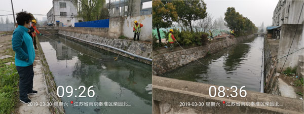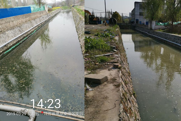 秦淮區(qū)果園河水體黑臭應(yīng)急治理工程,于2019年3月29日啟動。果園河應(yīng)急治理周期為30日歷天治理期內(nèi),采用RhP體系技術(shù),運用多種實施措施,僅3天水體臭味消除、水色轉(zhuǎn)為綠色、透明度提升到清澈見底。至4月10日,果園河水生態(tài)系統(tǒng)正在良性發(fā)展,水生態(tài)多樣性開始呈現(xiàn)、水質(zhì)指標(biāo)氨氮下降至5.0mg/L以下、溶解氧提升至4.0mg/L以上。