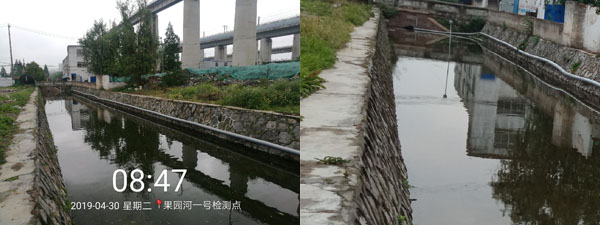 果園河治理前水色發(fā)黑,有刺鼻的臭味,水體透明度僅10cm,底泥呈黑色,水生動物活性弱,水面無光澤,水質(zhì)指標(biāo)超過地表水V類標(biāo)準(zhǔn)的6-7倍。
